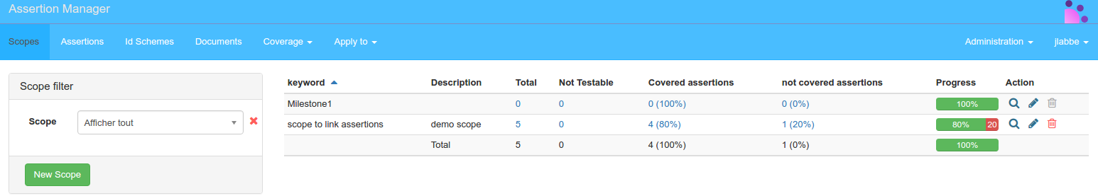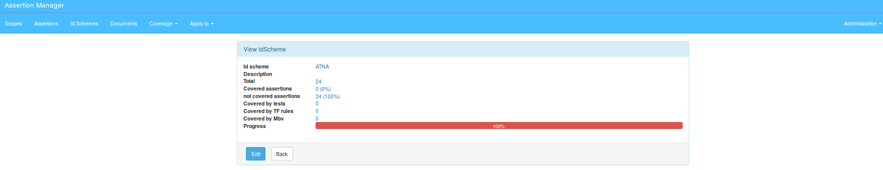 For each idScheme coverage statistics are displayed, and a progress bar to visualize assertion coverage.