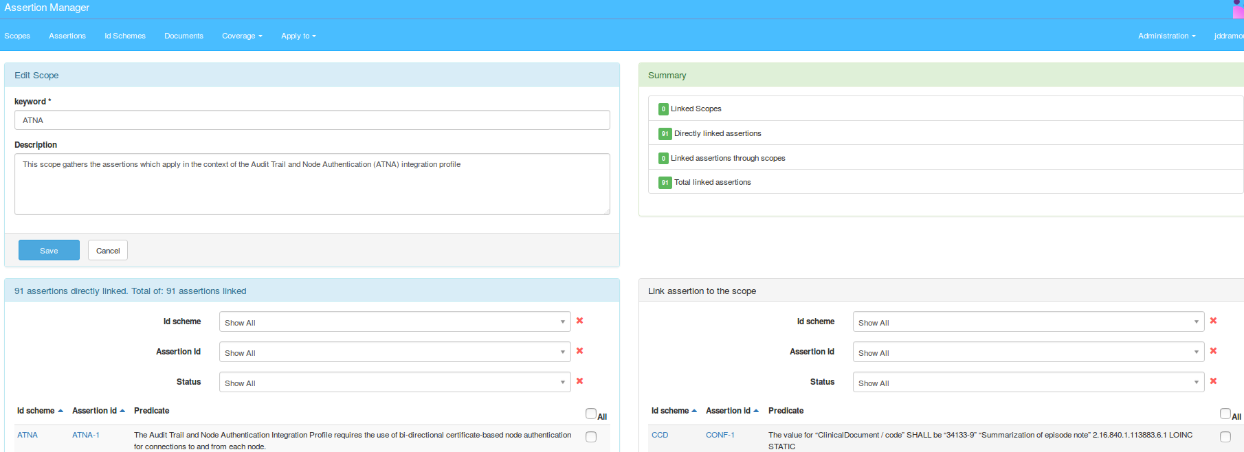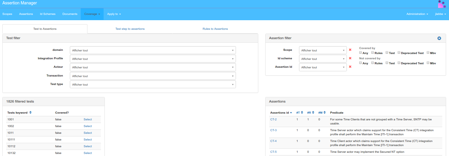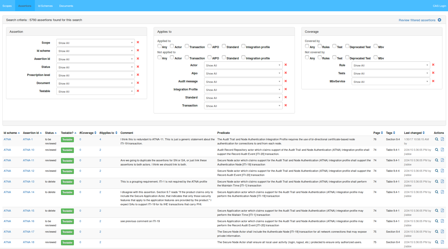 The page displayed lists all registered assertions and the seach criteria area to filter according to Assertion parameters, Applies to and/or Coverage: