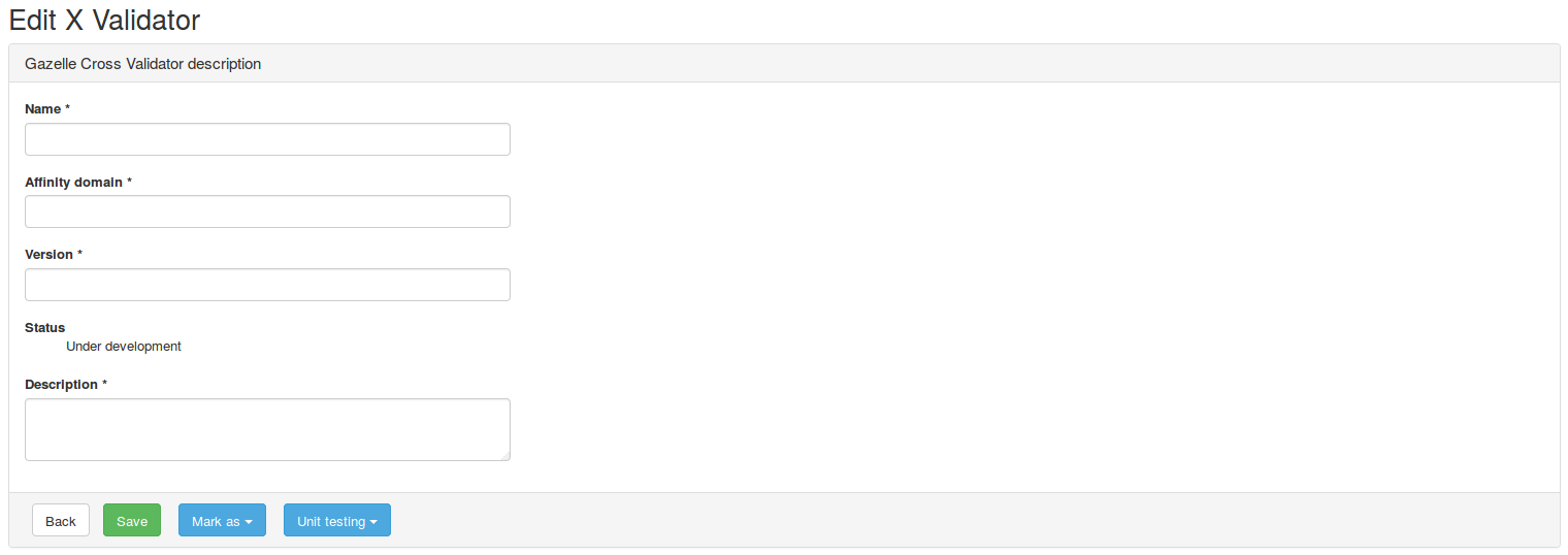 When only the validator part of the gazelle-x-validation module is enabled, creation and edition of validators and rules is not allowed. Administrators shall make use of the import/export validators feature to add and update validators.