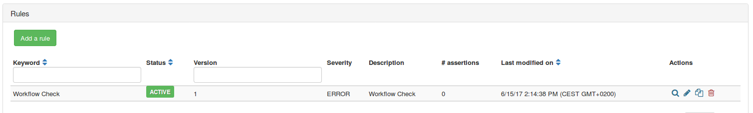 For each tests, you can see whether it is active or not, the rule which is tested and the result of the last run. In addition, it provides information about the version of the rule which have been tested during the last run, the last run date and the timestamp of the last successful run.