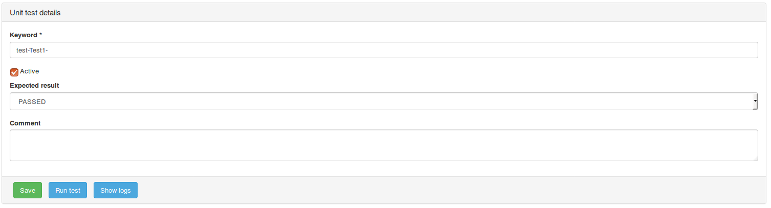 On that page, the details of the rule are put as a remember. Then, in the “Unit test details” panel, you are asked to provide a keyword for that test as well as the result which is expected. In addition, you can put a comment as a remember of the purpose of this test.