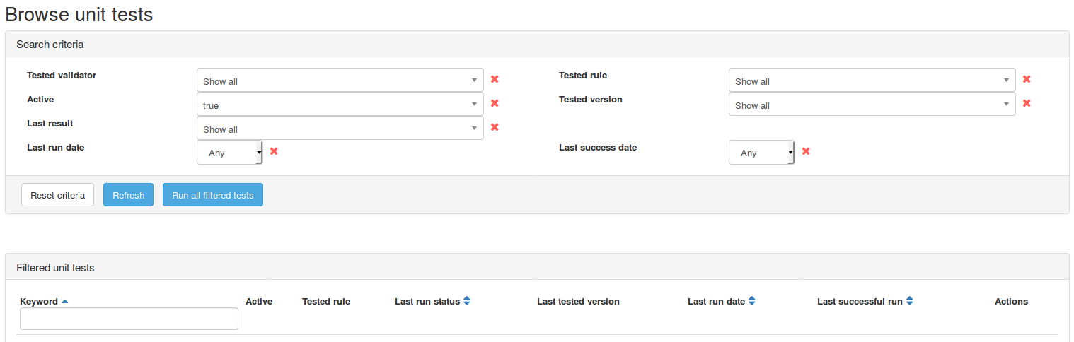 From the page which lists all the unit tests defined in the tool; on that page you can run tests individually or all the tests which are selected thanks to the search criteria. That means, that for instance, you can run all the tests which previously failed for a given validator.