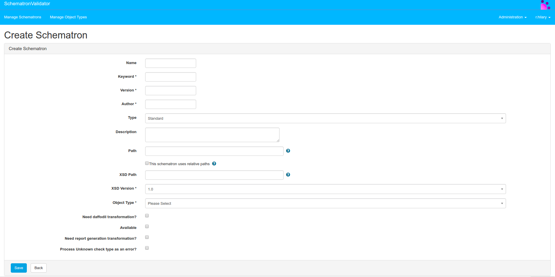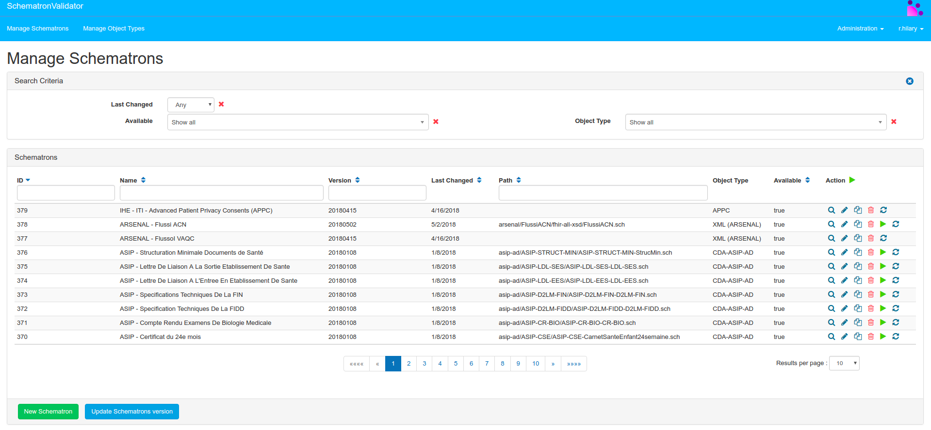 The Web interface Schematron Validator enables the administrator of the application to register new schematrons and update schematrons version: