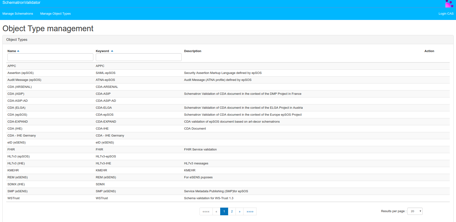 As a convention, the keyword of the object type is made of the short name of the standard the schematron has been developed for followed by a dash (-) and the affinity domain/extension (IHE, epSOS, ASIP …). This is how EVSClient builds the keyword to retrieve the list of schematrons.