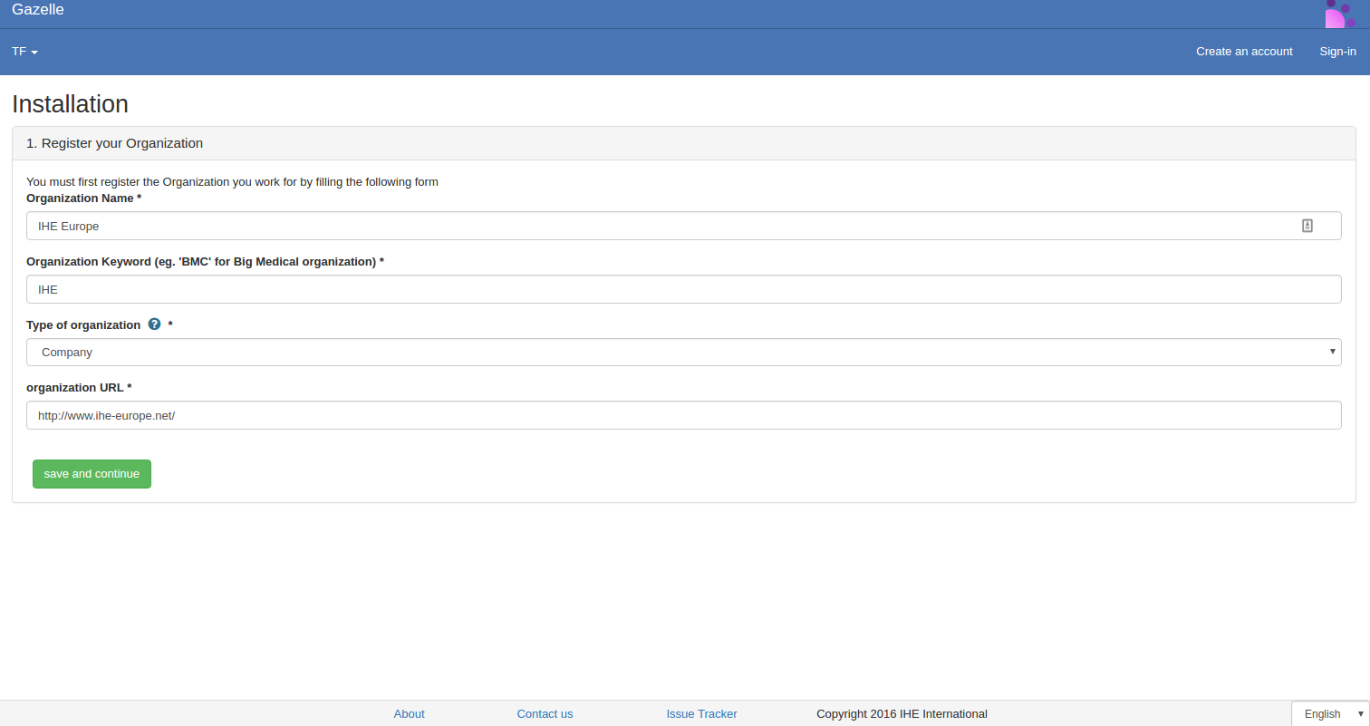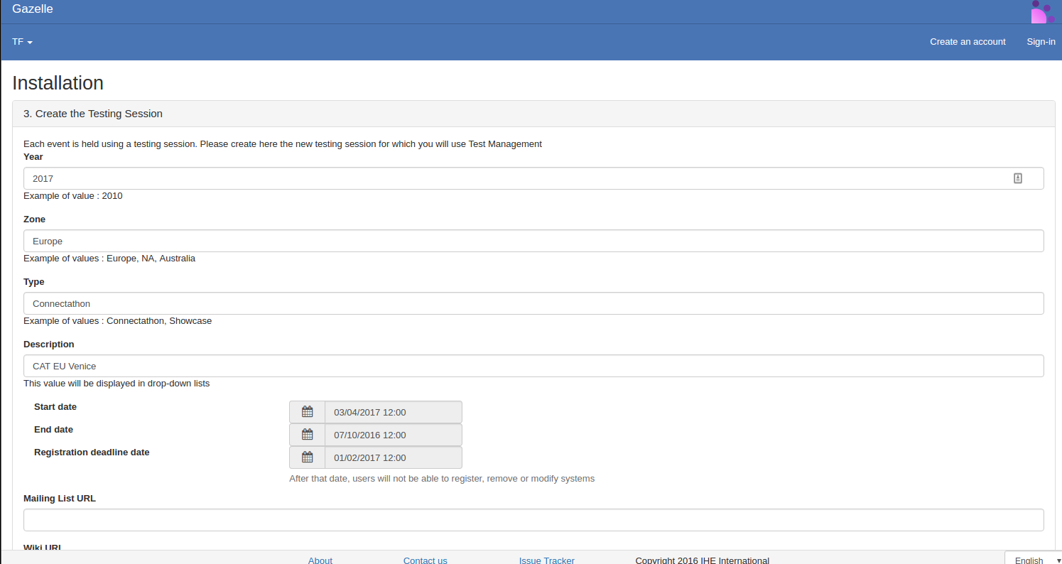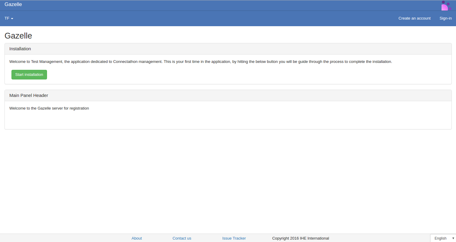 This instance of Test Management you have just deployed is free of organization, user and testing session. Consequently, the next step will be to create your organization, your account (as an administrator of the application) and the testing session. A testing session is used to hold one event, for example a Connectathon, a showcase or whatever requiring the use of Test Management. If the first part of the installation is successful, you should see the Gazelle home page (see file entitled Home page before installation).